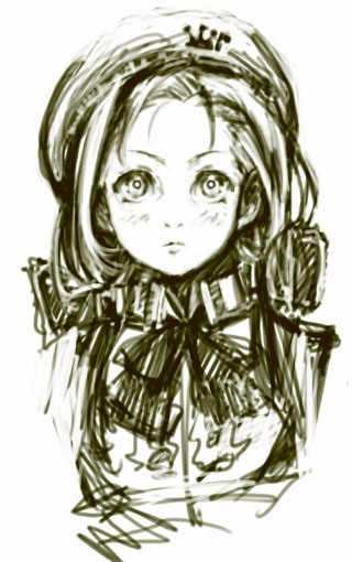今回ここでお見せするのは、デザイン中期頃のラフ稿です。うーん、ラフといいつつ、かなりや舞より随分年下の彼女ですが、何か鬼気迫る雰囲気がなんともでよい雰囲気です。