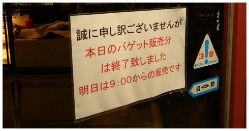 時間が遅すぎました……ワインレッドのお店の入り口に無慈悲な張り紙が。てゆか、この張り紙、ラミネートされてる…ってことは、やっぱり毎日品切れするのぉ>_<) 皆さんも狙いのパンがあるときは、パン屋さんには早めにねっ!