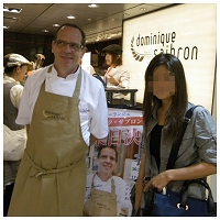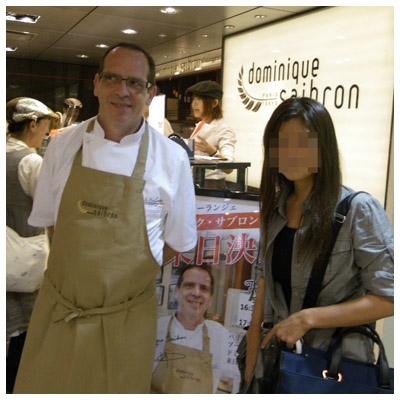 でね、その前日の9/30は仕事でバタバタだったのですけれど、移動の途中の渋谷でなんか思い立って、いつものパン屋さん巡回モードに突然移行した訳です。雨模様だったんですが、渋谷東急の地下食品ゾーンはもの凄い密度の激戦区で、短い時間に色々なパン屋さんを堪能できちゃうんです、はい。で、ここに出店しているドミニク・サブロン(赤坂本店を「君と明日のパンと冬の朝。」で取材しました♪)のショップにいったら、あ、あのお方はッ!なんと、サブロン氏が謎の緊急来日で、試食パンをお客さまに進めているのではありませんか。ああ、なんという神々しい笑顔。もちろん突撃して、記念撮影しちゃった!ミ、ミーハーじゃないんだからねッ!